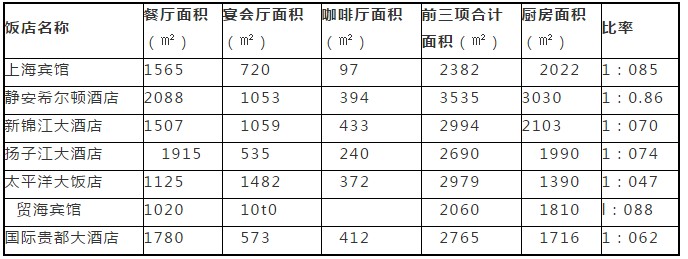 表2 為幾家著名飯店餐廳、宴會廳、咖啡廳與廚房面積統(tǒng)計