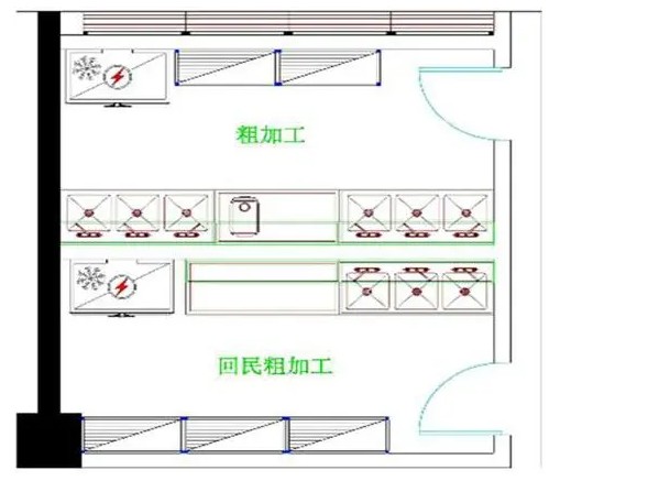 粗加工區(qū):為滿足衛(wèi)生要求,對(duì)原料分別進(jìn)行清洗和切割,不得與廚房其他區(qū)域交叉。