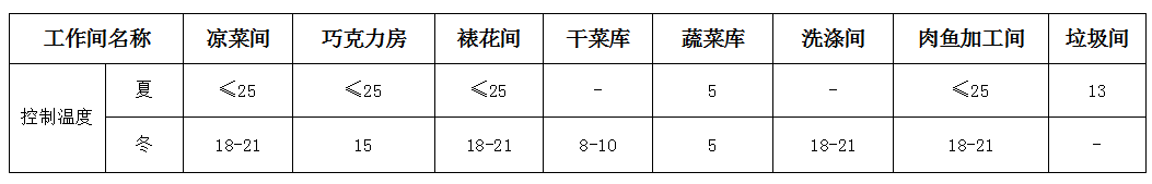 在規(guī)范中對工作專間有明確的定義:“指處理或短時間存放直接入口食品的專用操作間包括涼菜間、裱花間、備餐專間等。”我們這里的專間包含了其他專用工作間。各種專間溫度控制參照規(guī)范的要求和一般做法。設(shè)計(jì)人員要結(jié)合實(shí)際提出設(shè)計(jì)要求,例如.大型食堂和快餐店,在就餐準(zhǔn)備之前有大量的食材要加,特別是魚、肉、禽、在室溫下擱置較長時間,不能隨時進(jìn)行冷藏保鮮,夏季對室內(nèi)的溫度就要嚴(yán)格控制,或增加保鮮設(shè)備的容積、便于及時冷藏,防止經(jīng)過浸泡、擇洗、改刀的食材變質(zhì)。嚴(yán)格控制各區(qū)溫度和濕度是控制微生物生長、保證食品安全的關(guān)鍵。不同區(qū)域環(huán)境有不同的溫度和濕度要求。主食庫、調(diào)料庫、干品庫只要控制濕度,各加工區(qū)需要控制溫度,見下表