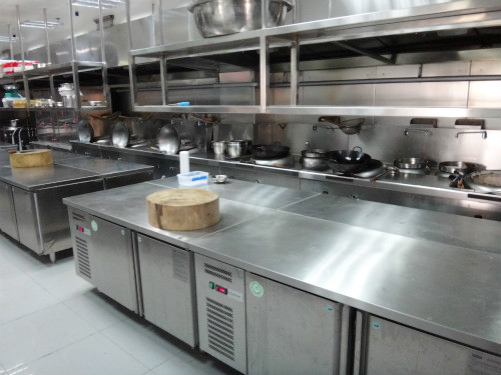 3、儲(chǔ)藏設(shè)備:其分為食品儲(chǔ)藏部分,包括常溫和低溫設(shè)備:平板貨架、米面柜、打荷臺(tái)冰箱、冰柜、冷庫(kù)等,器物用品儲(chǔ)藏部分調(diào)料柜、售賣工作臺(tái)、各種底柜、吊柜、角柜、多功能裝飾柜等。