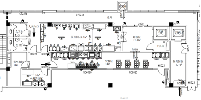 庫房區(qū)→廚房粗加工區(qū)→廚房區(qū)