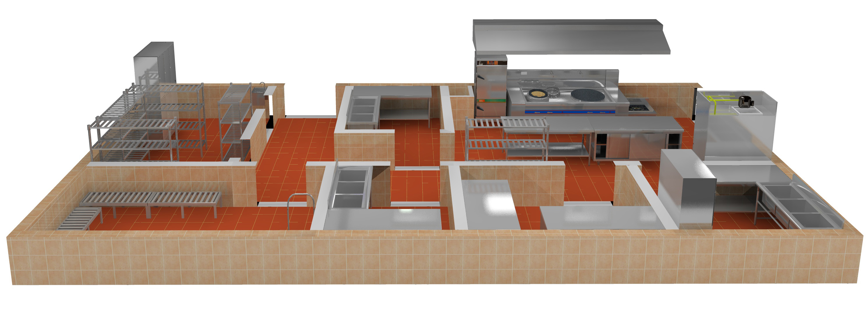 對于較大的廚房,如條件允許,設(shè)計前就應(yīng)向經(jīng)營人員說明提升粗加工間管理模式的設(shè)計意圖,便于設(shè)計工作的進(jìn)行。把粗加工間對蔬菜摘洗、原料宰殺等初步加工任務(wù)擴(kuò)大并提升為由于水產(chǎn)品及肉禽類原料易于污染變質(zhì),為防止肉類、魚類與蔬菜同池洗摘、同案宰殺集中管理的配送中心串味污染,肉類、魚類、禽類、蔬菜類應(yīng)分開洗摘、宰殺加工。為肉類、魚類、禽類宰殺配置專用的配套設(shè)備。如配置帶瀝水宰殺臺的水池,在水池上,邊宰殺邊清洗。肉類、海鮮、蔬菜等分類的加工區(qū),各司其職,并且做到凈菜、改刀、配分、腌醬后,按需要數(shù)量送到熟制加工間。如果條件不允許,面積不夠,最好設(shè)置葷素分開的加工區(qū),清洗時分開水池,改刀時分開工作臺或菜墩。